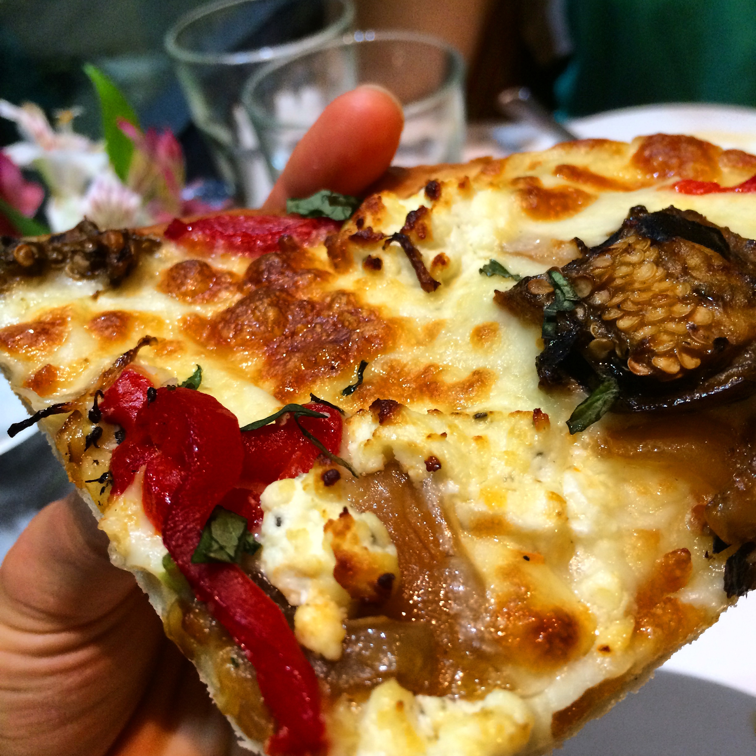 The pizza is also a little lackluster. We chose the gluten free crust, which was thin, crunchy, and a little sweet – everything I could ask for in a thin crust pizza. However, the melted mozzarella cheese dominates the pizza. It unfortunately masks the earthiness of the eggplant, the sweetness of the onions, and the deep flavor of the red peppers. The goat cheese, however, enhances the pizza by offering surprise bites of creamy tang.