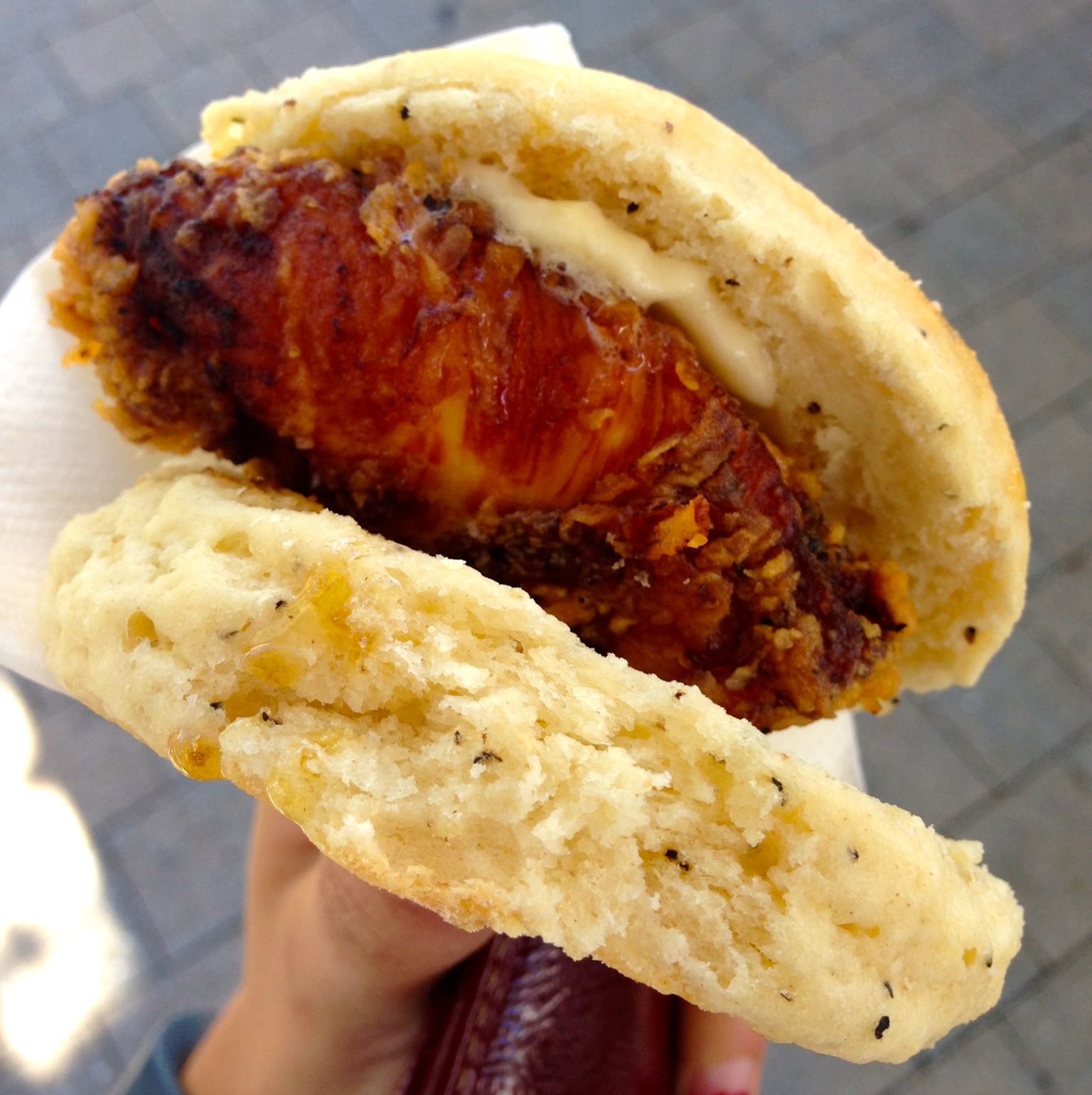 Afterward, she switched to savory and selected a honey butter biscuit filled with fried chicken, and topped with maple syrup.