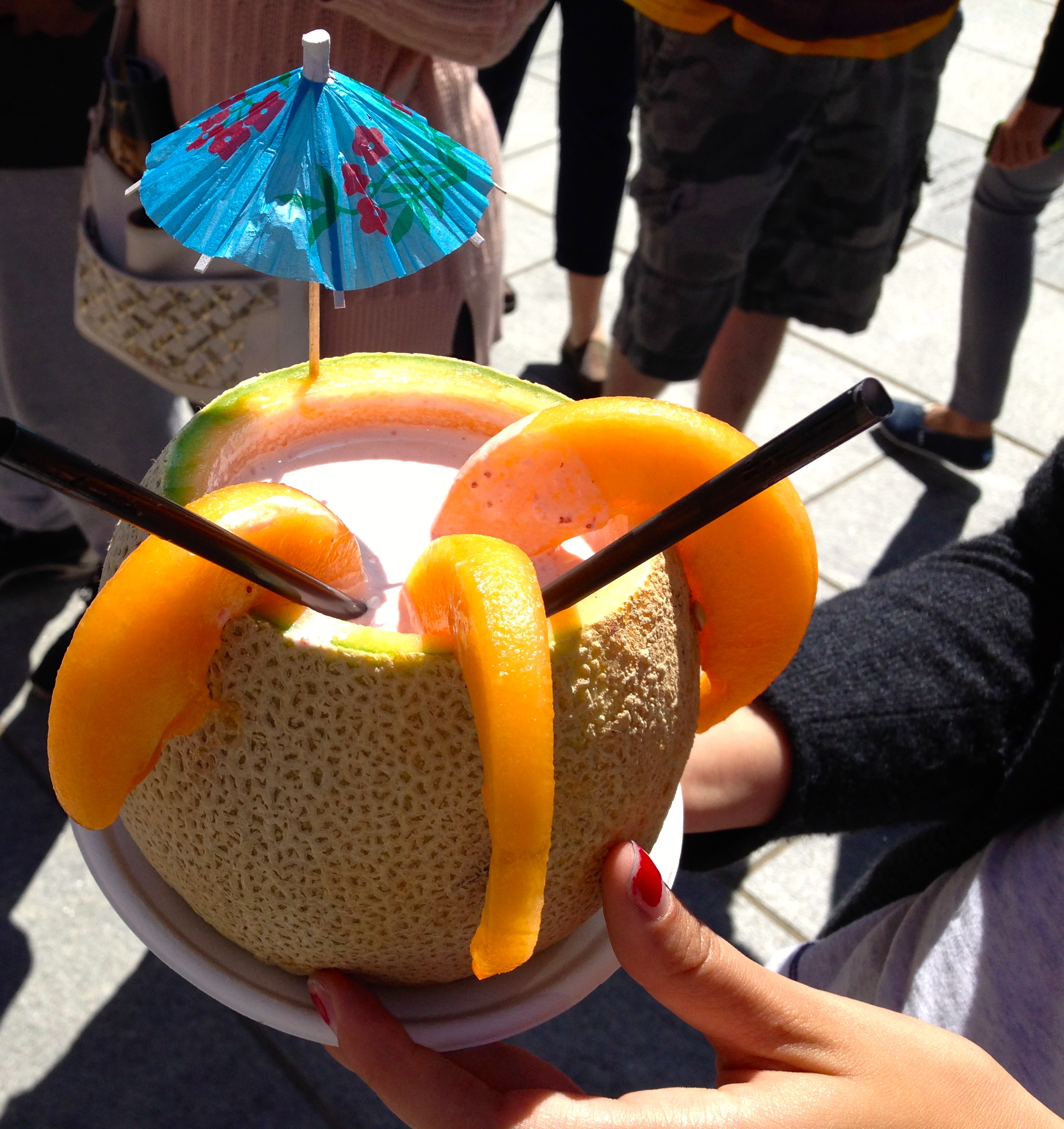 My friend started off sweet, enjoying a cantaloupe filled treat. The fruit just provided the container, and was filled with something that resembled a strawberry smoothie that attracted all sorts of attention throughout the remainder of our stroll.