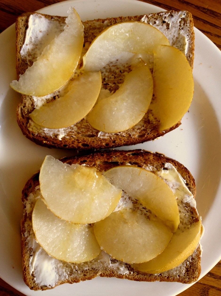2.) Cut a pear into thin slices and arrange on top of toast.