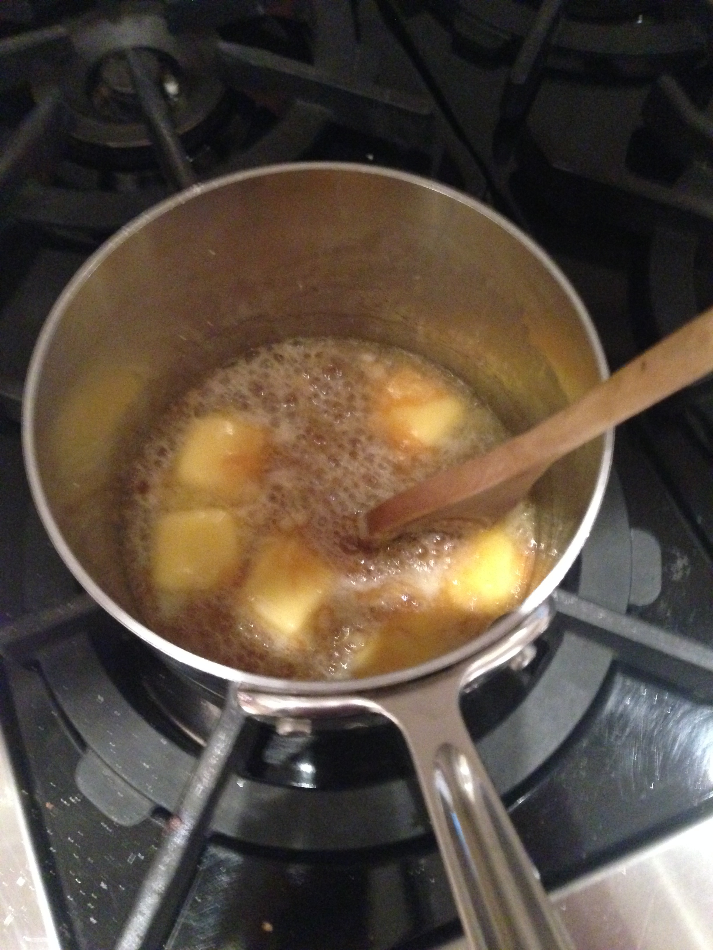 Heat granulated sugar in a medium saucepan over medium heat, stirring with a wooden spoon to ensure that the sugar does not burn.  The sugar will eventually form clumps and turn into an amber-colored liquid as you stir.