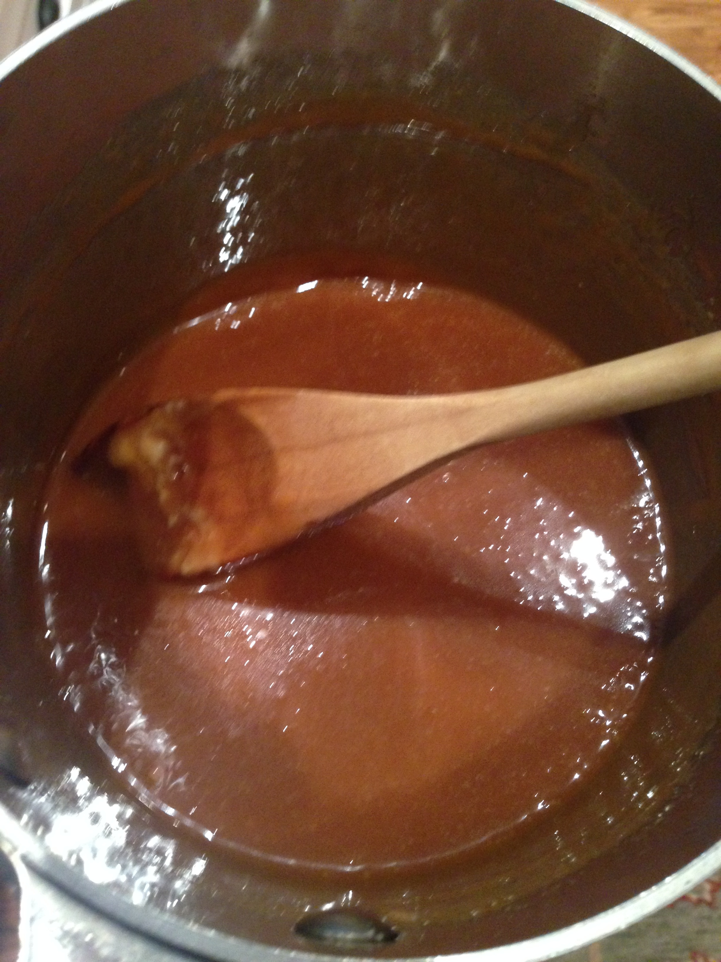 Once it is all melted, remove from heat and add the remaining chocolate into the melted chocolate.  Stir until all of the chocolate is melted.  Pour all of the chocolate onto the foil in the baking dish. Using a spatula, spread out the chocolate across the bottom of the dish.  Allow to set for 30 minutes at room temperature. Do not cheat and put it in the refrigerator! This will cause the chocolate to become too hard. During this time, make the salted caramel!