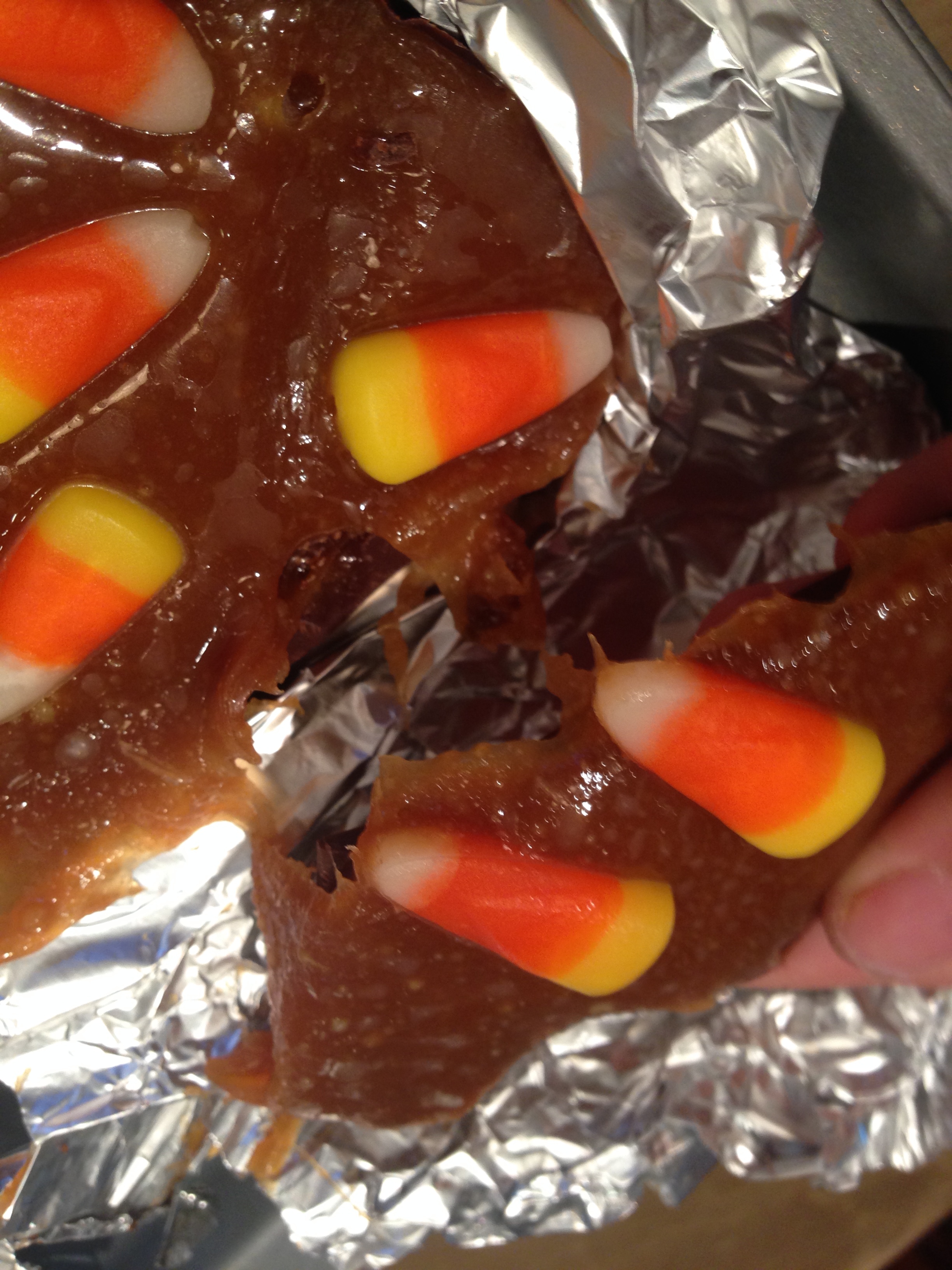 Once the salted caramel is cool, pour over the hardened chocolate layer (make sure that the chocolate layer is hardened before adding the caramel!)  Immediately sprinkle the candy corn over the salted caramel, pressing each individual corn into the caramel. Allow the bark to set for 30 minutes to an hour.  Enjoy!