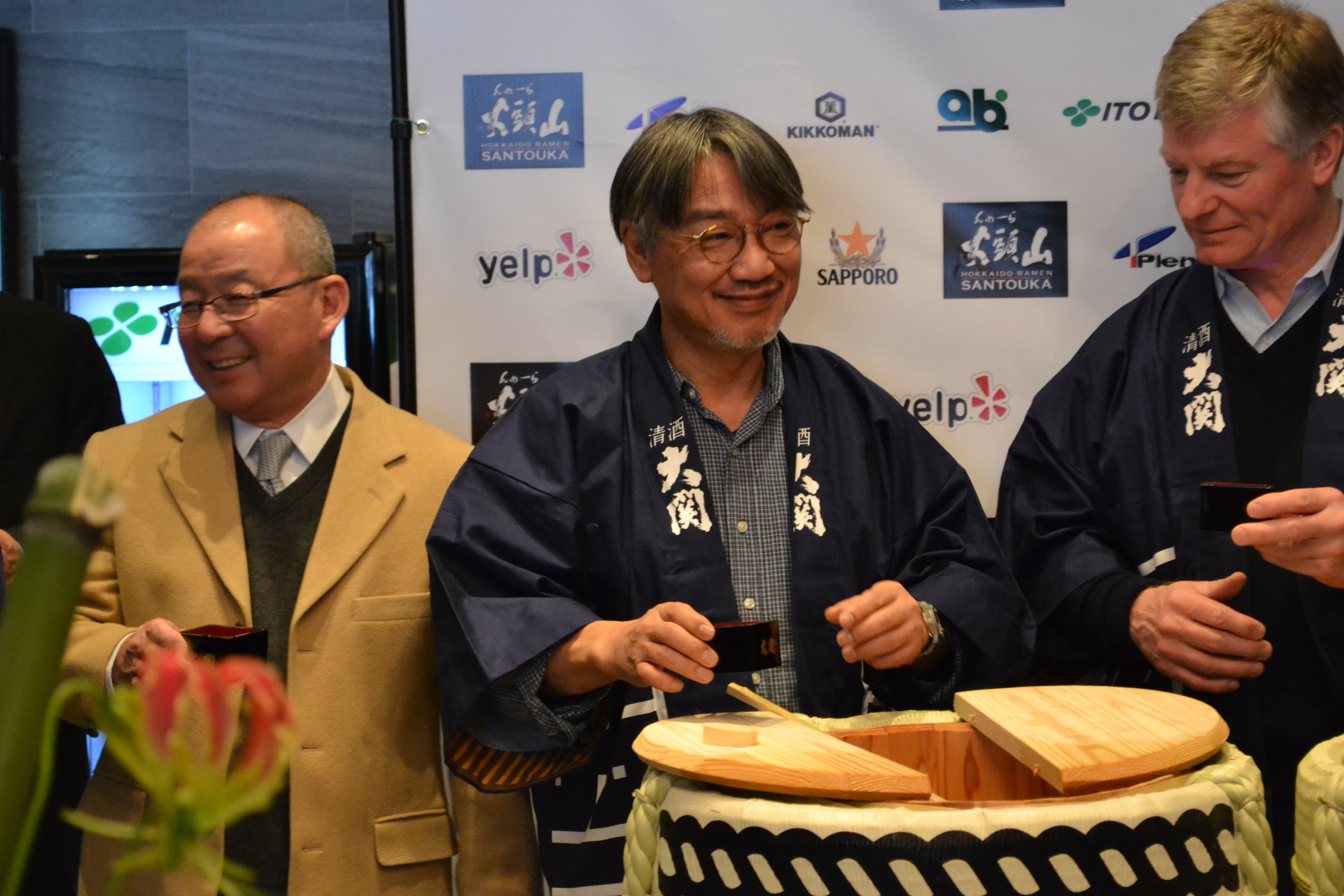 Mr. Hatanaka, pictured middle, helps serve saké to the attendees of Monday’s opening.
