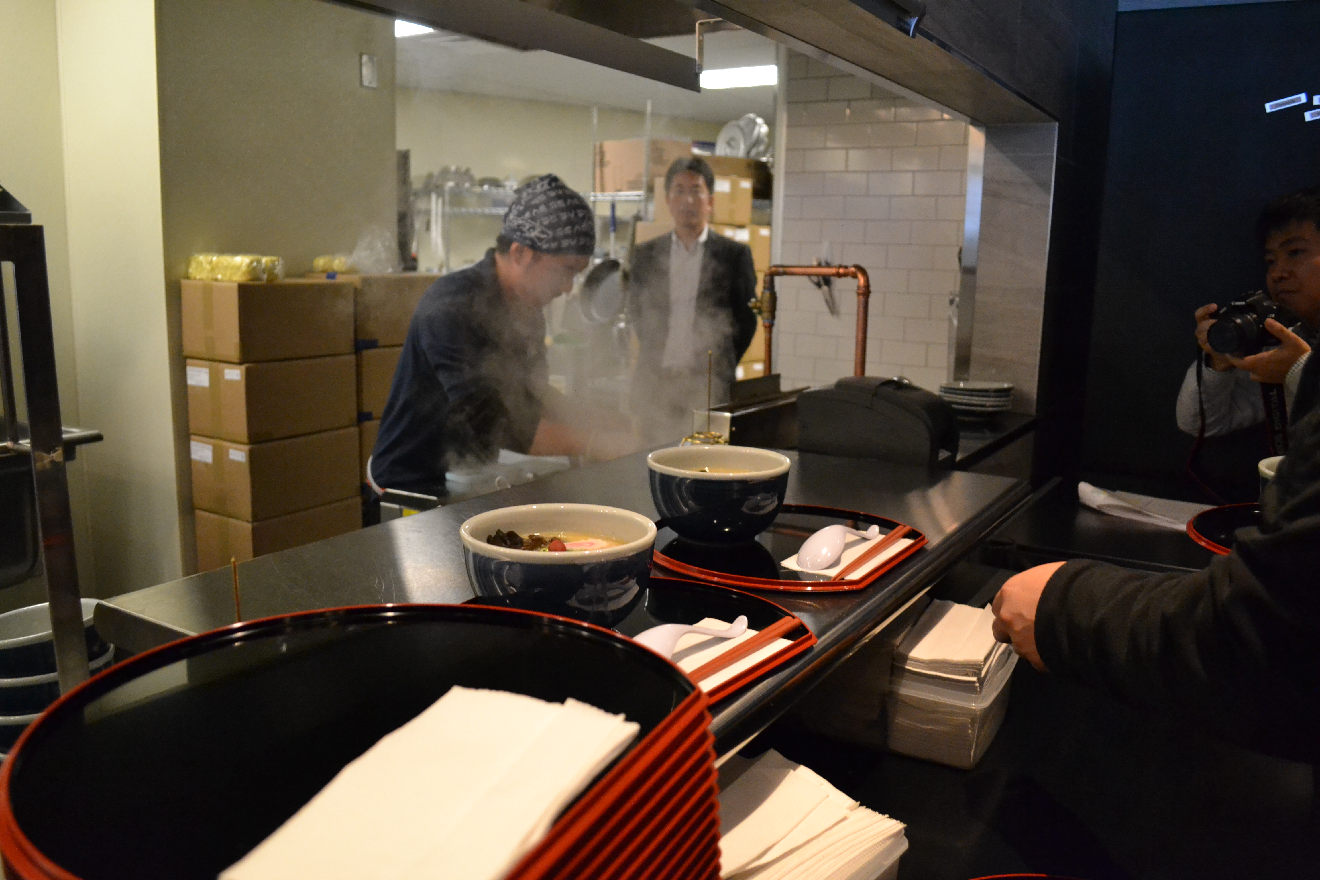 Once just a small, nine-seat ramen shop in the Hokkaido region of Japan, Santouka Ramen is now an international business with locations from Malaysia to California. Throughout all this sucess, Mr. Hitoshi Hatanaka seems to have maintained Santouka’s character, as well as his own. At Monday’s private opening, scenes from the hit Japanese comedy, Tampopo, which Hatanaka cites as the inspiration for the opening of his first shop, were shown to instruct the attendees in the proper way to both slurp, and cherish, their ramen.