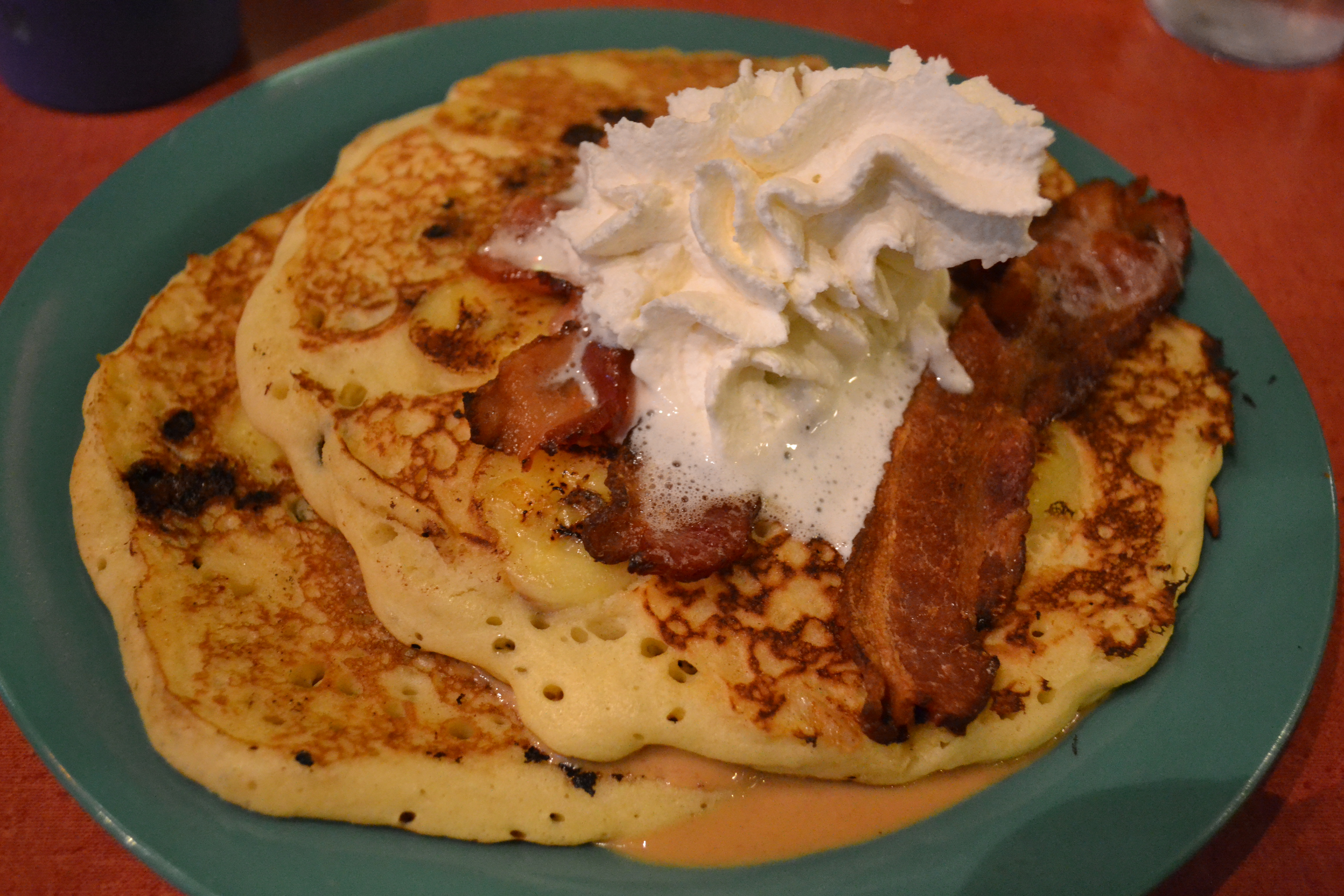 However, we both agreed that the pancakes were out of this world. The sinfully rich peanut butter sauce soaked into the fluffy pancakes, giving them the perfect consistency. The pancakes themselves were stuffed with perfectly ripe bananas and chocolate chips, but their sweetness was offset by the crispy bacon. Elvis would be proud to have these pancakes named for him.
