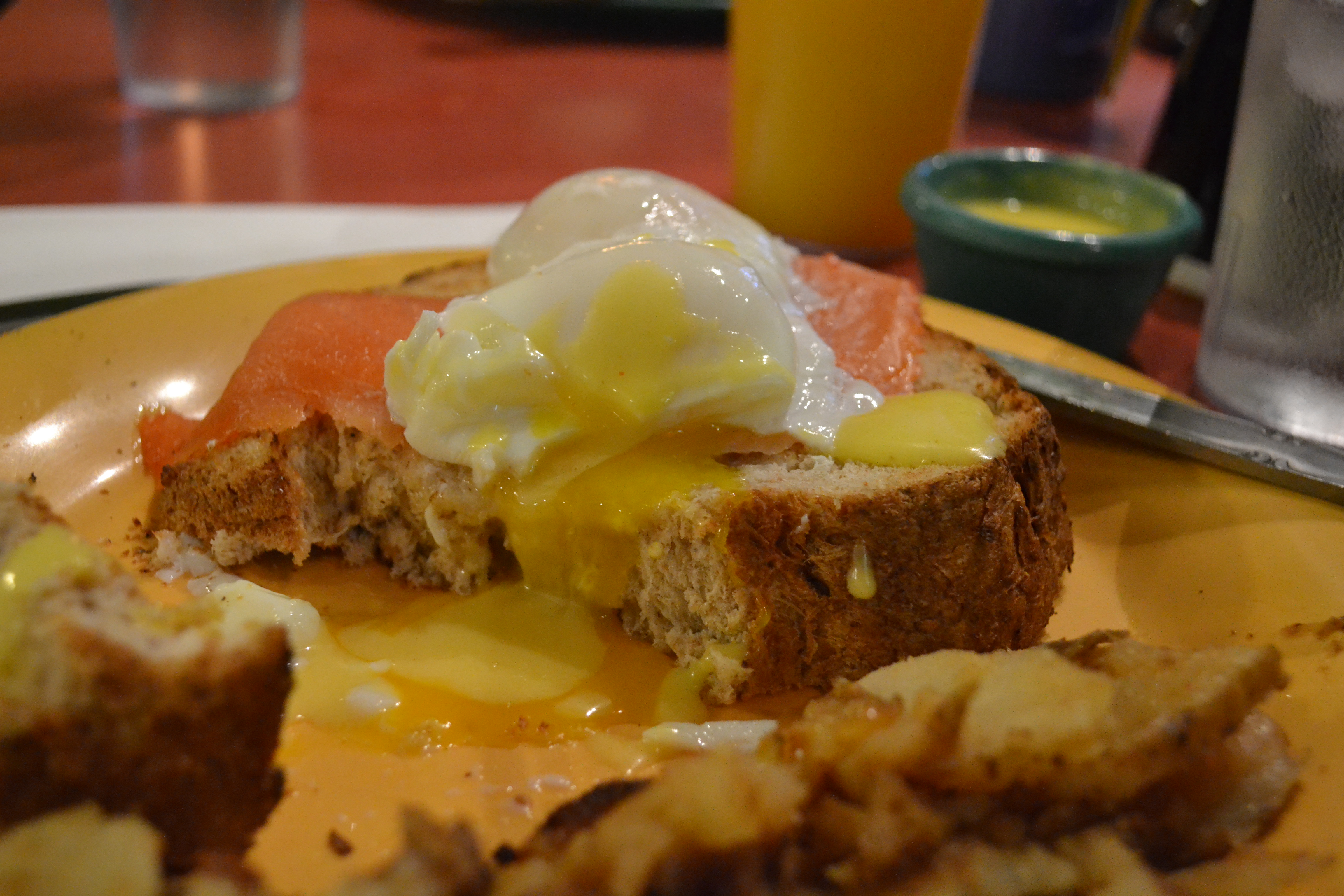 Now, for the reason we came: the food. The menu offers both breakfast and lunch options, and many stood out. The oatmeal raisin pancakes with berries and homemade whipped cream and the Rob Roy, a burrito stuffed with chicken, corn salsa, black olives, brown rice, jalapeno jack cheese drizzled with chipotle and Jack Daniels BBQ sauce, both looked tempting. However, my friend and I ultimately settled for the King Cakes—creamy peanut butter sauce sandwiched between two banana chocolate chip pancakes and topped with bacon and homemade whipped cream—and the smoked salmon eggs benedict. I also opted to try the coconut-flavored hot cocoas, and my friend ordered orange juice.