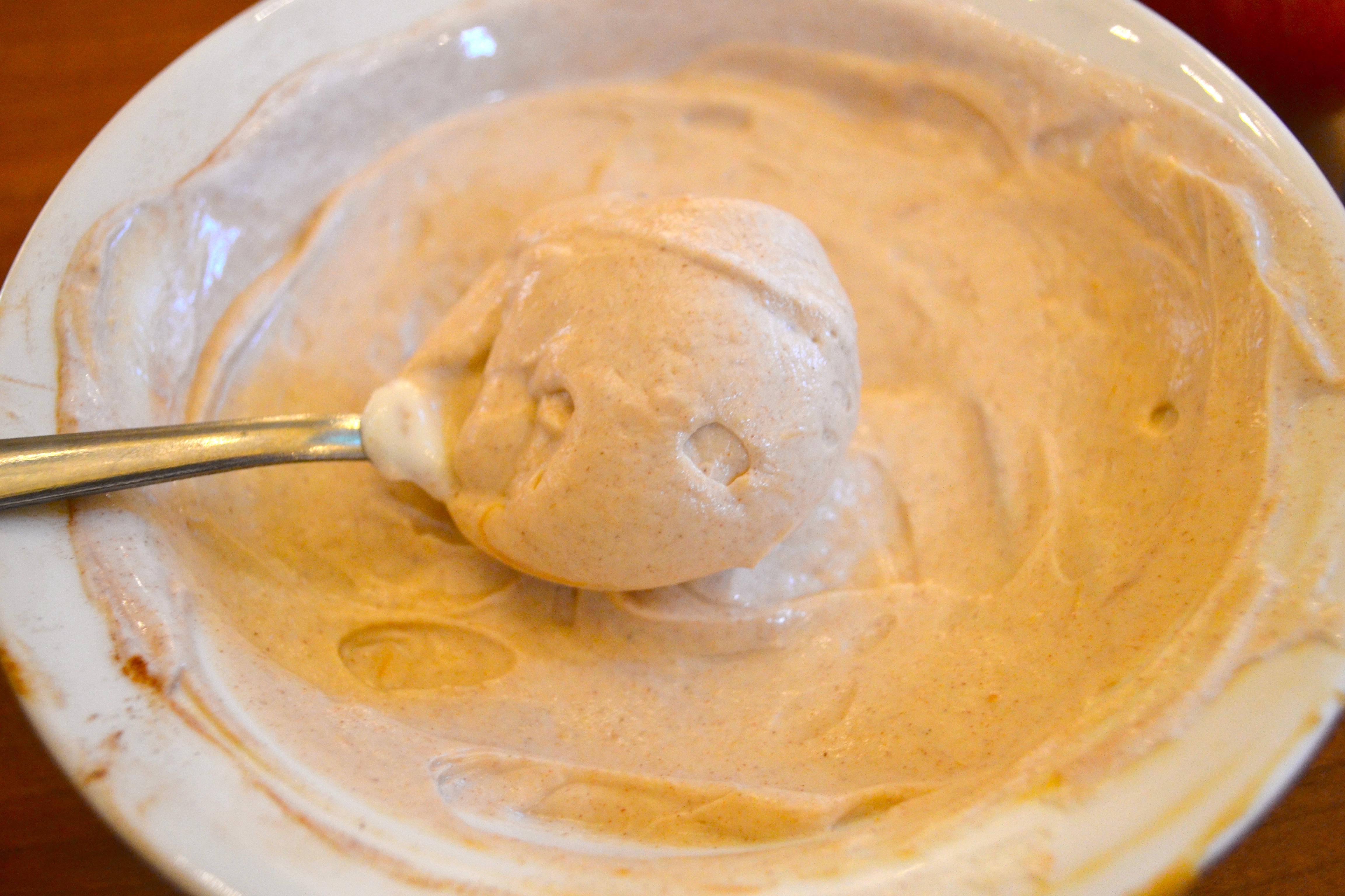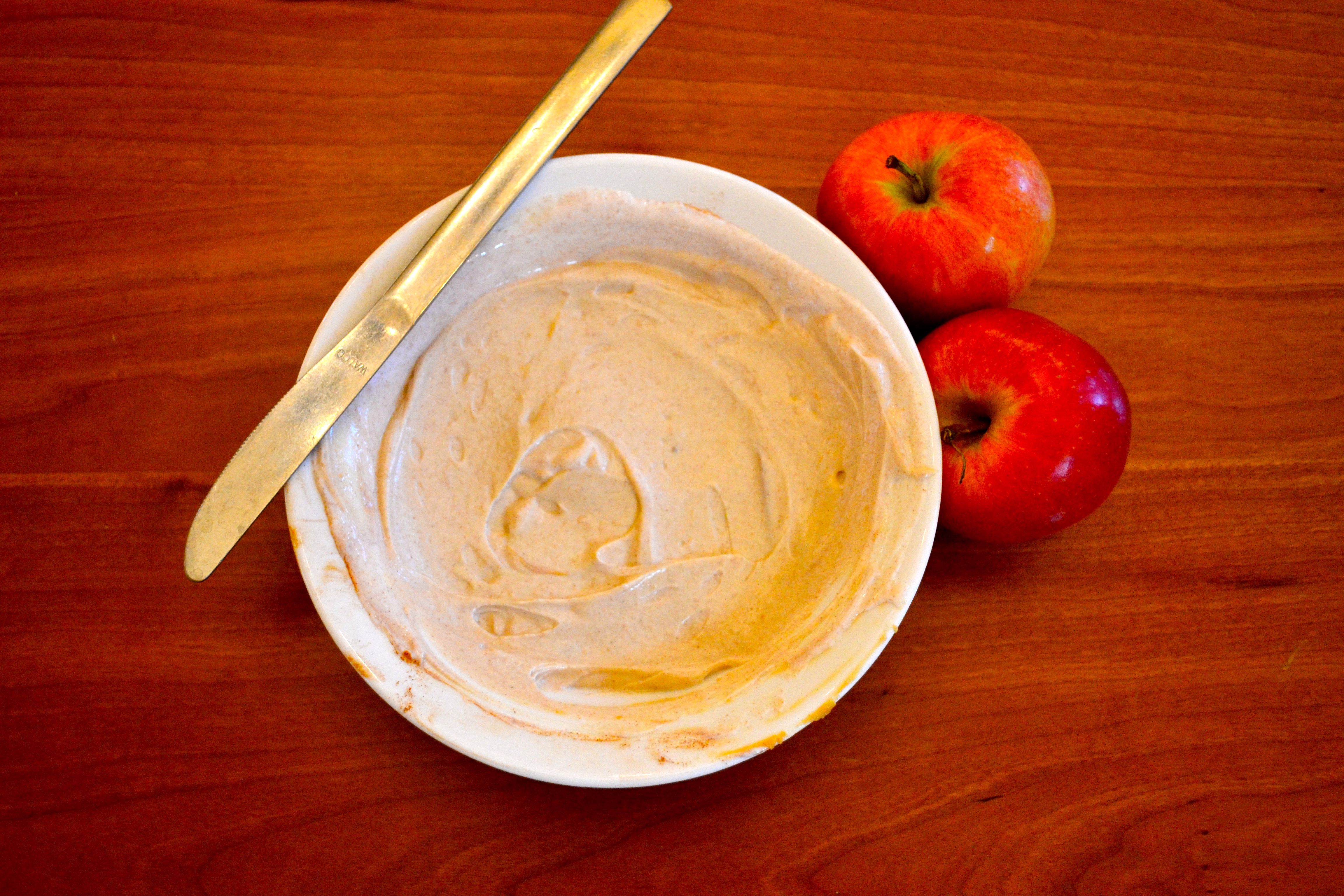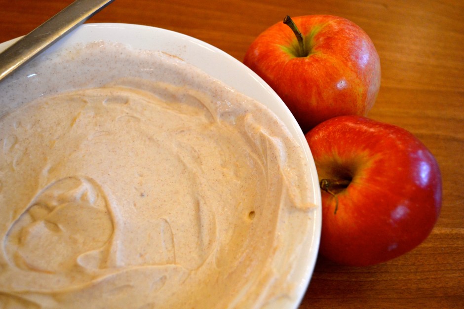 One of the best things to eat in the d-hall at this time of the year are the apples.   After a while, though, I get sick of eating them plain or with peanut butter.  This creamy, cinnamon-y dip is the perfect complement to the crisp, tangy apples, and all of the ingredients for it can be found in the dining hall!