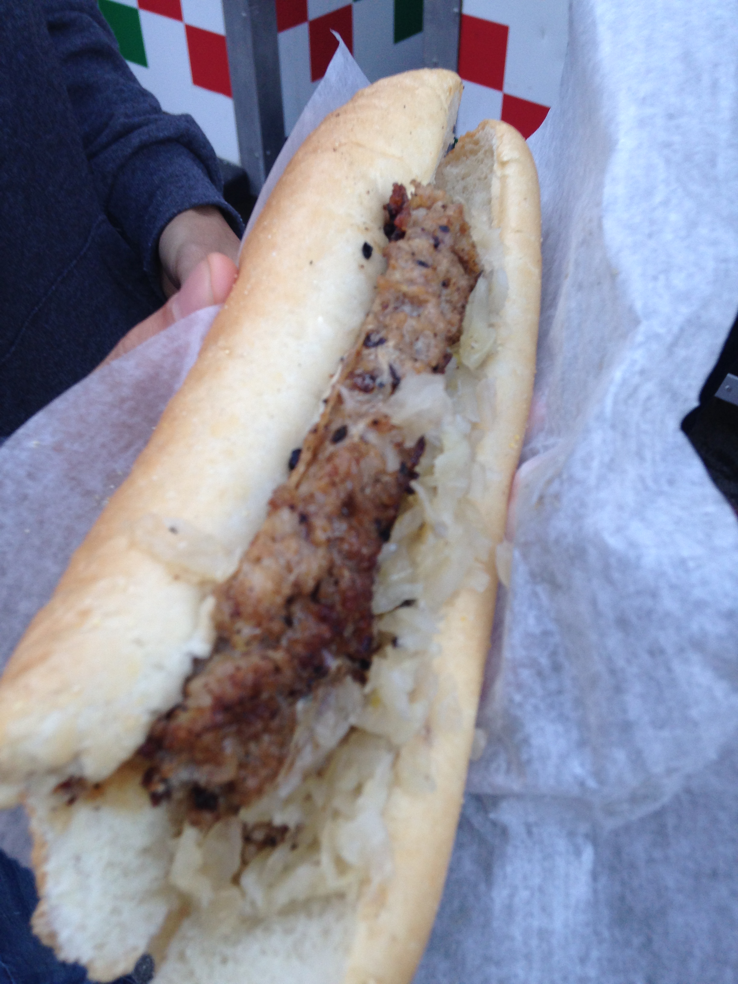 Authentic German Bratwurst served in a bun with sauerkraut.
