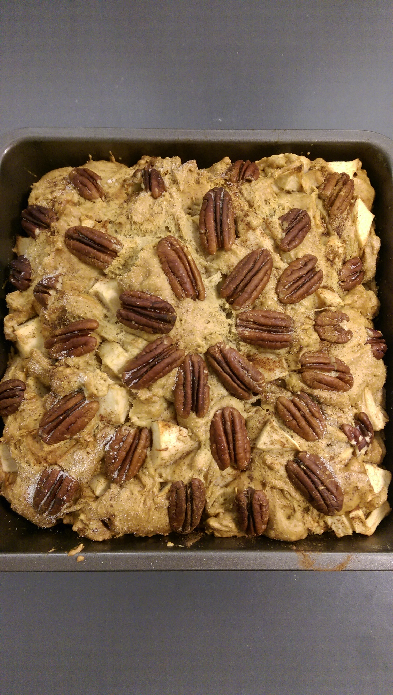 5. Pour batter into prepared pan. (Optional: Arrange pecans on the batter. Sprinkle cinnamon and sugar over the top.)4