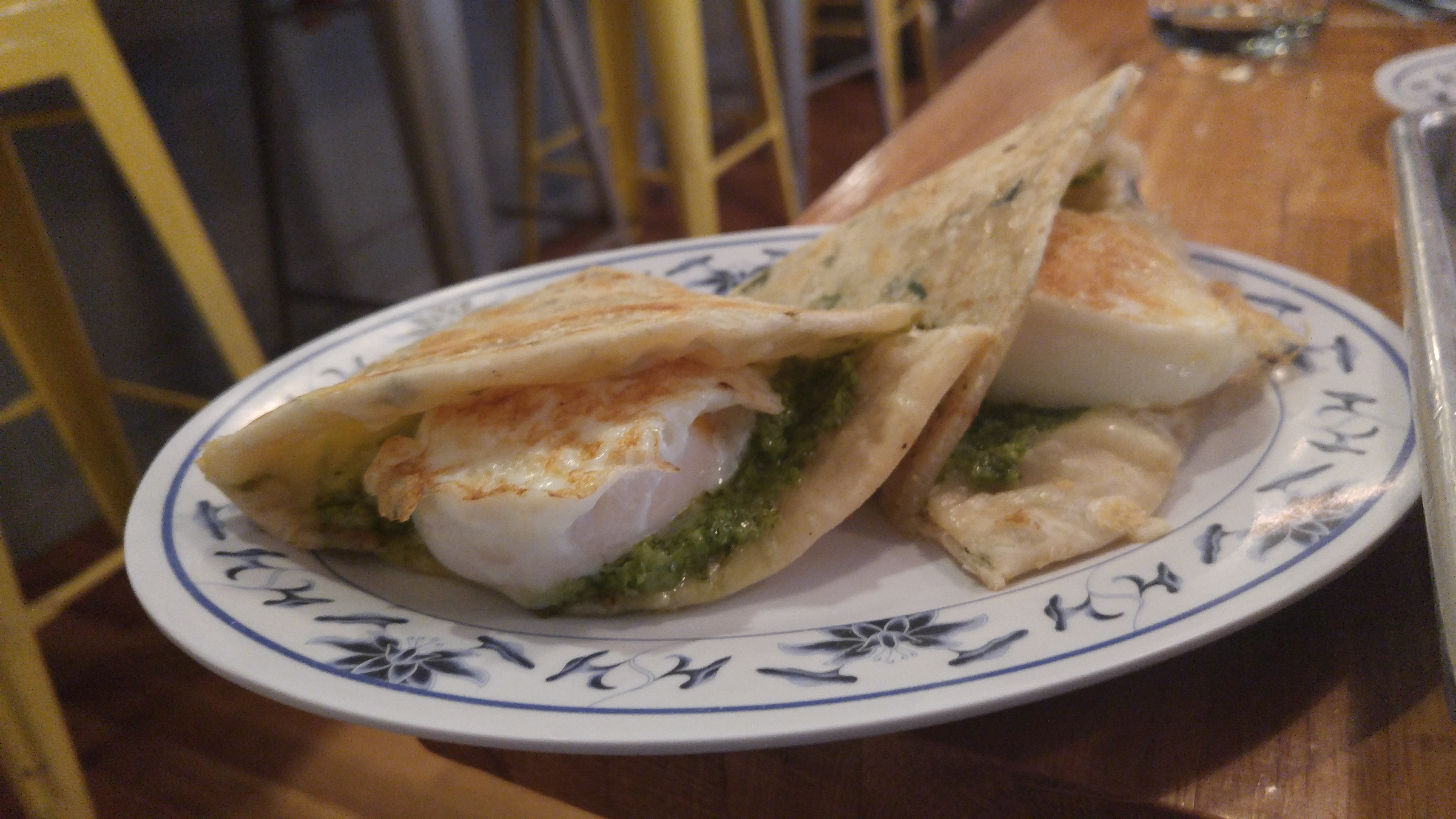 Mei Mei’s Double Awesome is regarded as one of the best “sandwiches” in Boston, with a scallion pancake caressing two beautifully fried eggs with pesto and cheddar. Utilizing the Asian scallion pancake as a “wrap” for non-Asian ingredients like pesto and cheddar is a testament to Mei Mei’s Asian Fusion brand. As I bit into the soft, but crisp pancake, the egg burst open, releasing its rich yolk to mix with the earthy pesto and creamy cheddar. While somewhat difficult to eat, the Double Awesome is exactly as promised; it is indeed awesome. The untraditional pesto, mixed with chives and other Asian herbs, provided the necessary green to balance the liquid egg yolk and melted cheddar. It is difficult to describe the savory mess that this becomes as the egg yolk drips from the wrap, but I promise you it is worth it. If you ever have the chance to visit Mei Mei, the Double Awesome is a must!