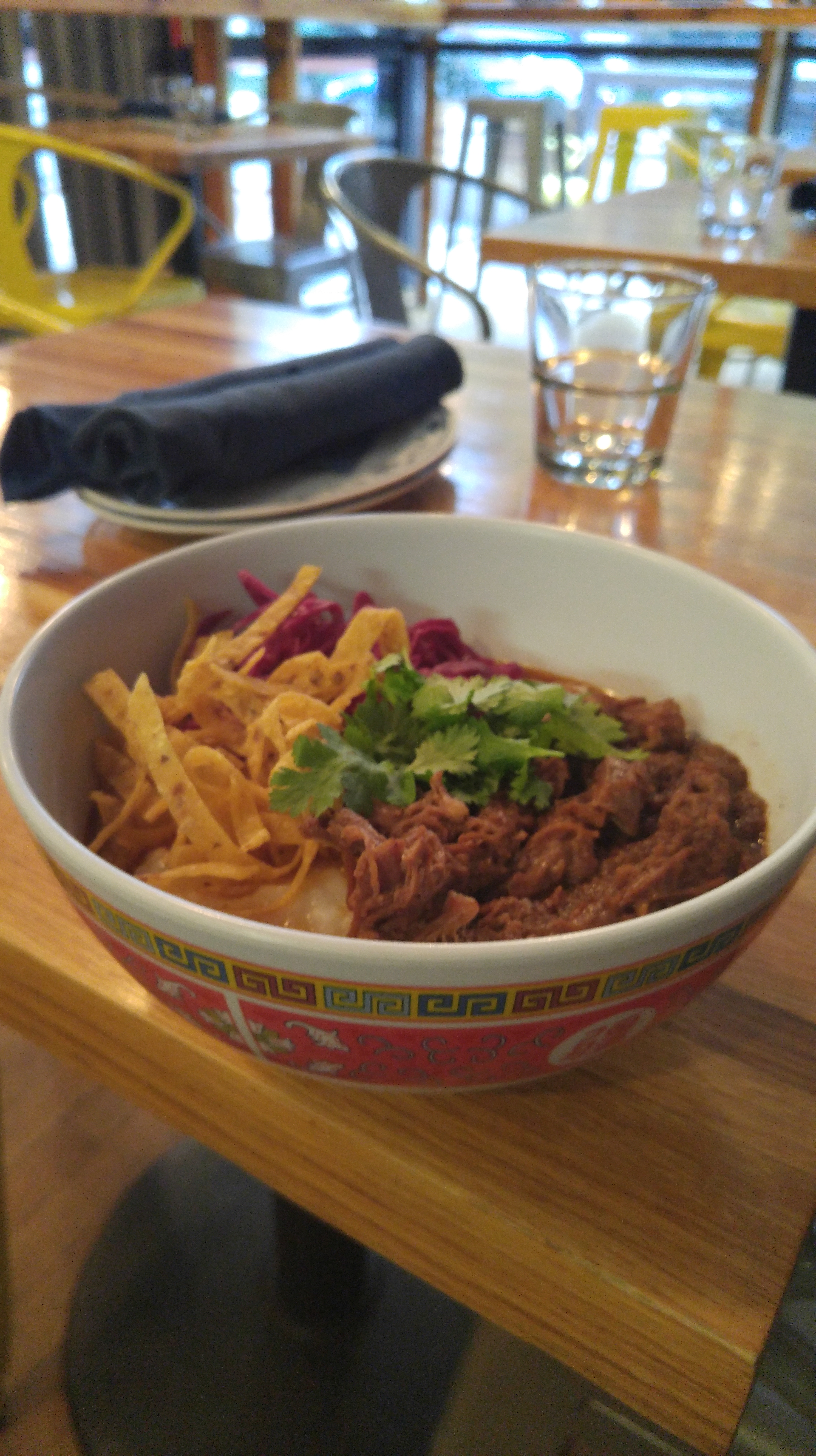 20151024_170018 The rest of the meal proceeded without a hitch, as we vacuumed up our portions. The braised beef porridge with cabbage and tortilla strips seemed bizarre at first, but it was perfectly nostalgic. While the porridge was a little grainier than I was used to, the warm, flavorful broth reminded me of home. However, this was more than a normal porridge. With the salty beef broth, crisp tortilla strips, and acidic cabbage, the dish was perfectly balanced both in flavor and texture. It may have seemed a little peculiar at first, but the dish was the ideal combination of nostalgic flavors from home with exotic accompaniments.