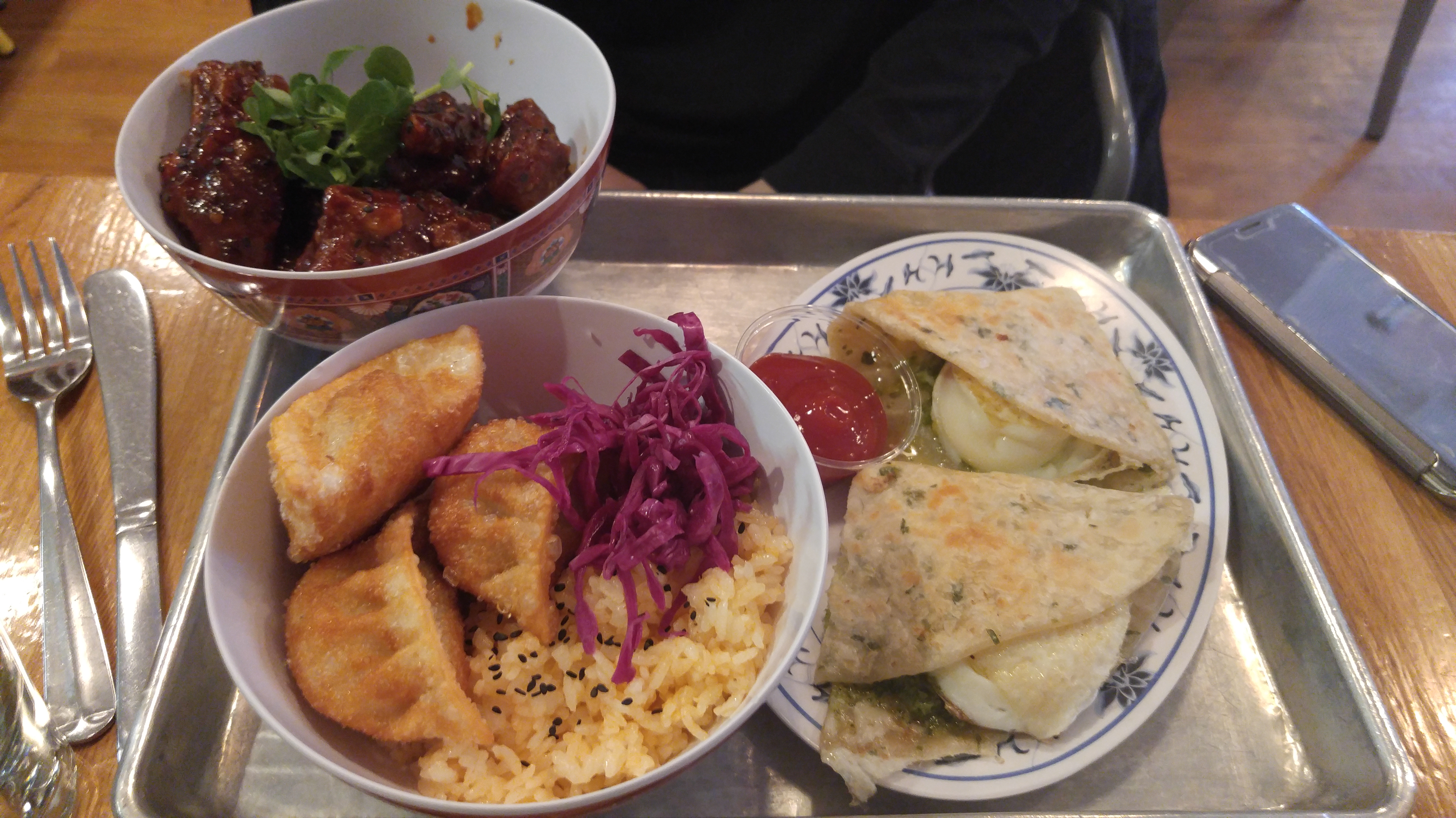 With the famous Double Awesome, a braised beef porridge, and a steamed bun with compound butter, I stared at my tray contently. My friend’s pierogi dumplings and rib tips accompanied his Double Awesome, as we snapped our pictures before digging in.
