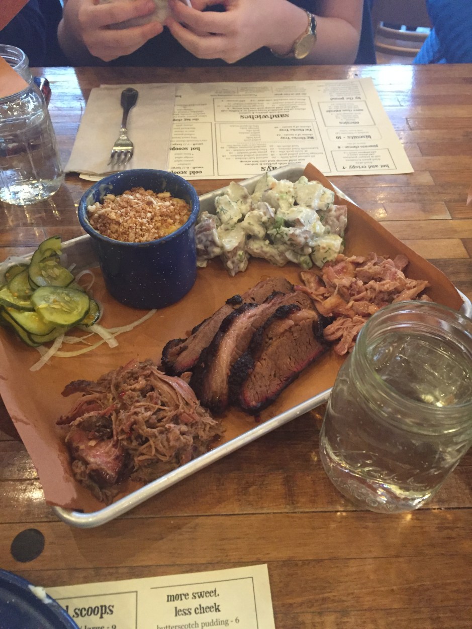 Now, for the star of the show: the barbecue. By this point in the meal, I was already overflowing with biscuits and sweet tea, but I soldiered on so as to make room for what I really came for. A friend and I decided to split the Fat Cheeks Tray, which allowed us to pick three kinds of meat, a cold side, and a hot side. We decided on pulled pork, pulled chicken, and brisket, with sides of mac n’ cheese and potato salad.