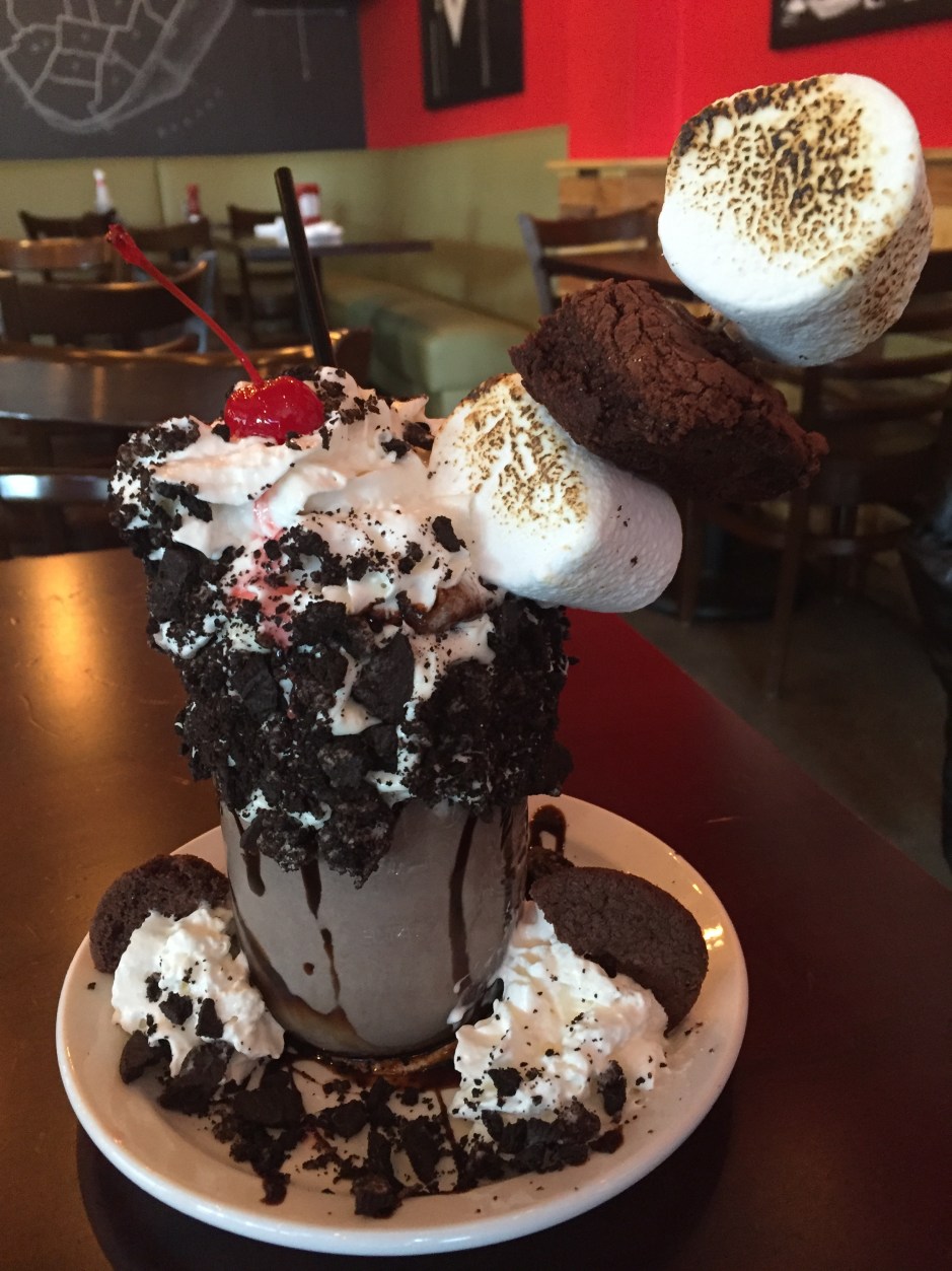 This trend originated in Black Tap Burgers and Beer in NYC and has found its way to our very own Boston Burger Company!  Dubbed “freak frappes,” these milkshakes are topped with m&ms, brownies, toasted marshmallows, and even bacon. Caroline and I decided to investigate these high-calorie treats to see if they were worth the hype.