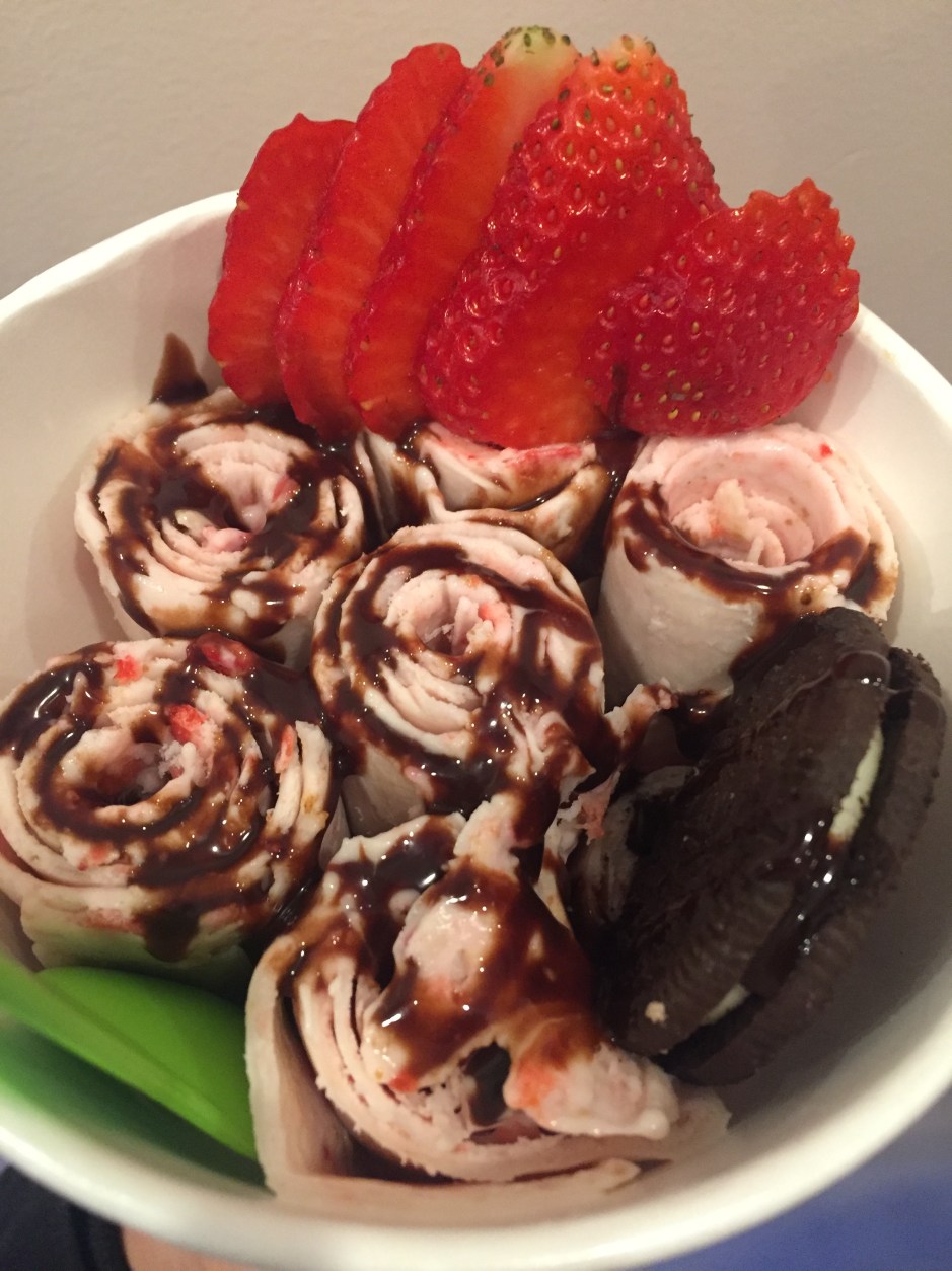 My ice cream buddy and I opted to try the First Kiss, which had strawberries, graham crackers, and chocolate sauce, and the Cookie Monster, which had Oreos. We watched in awe as the server poured a creamy liquid onto the cold surface, sprinkled on our desired toppings, and skillfully manipulated the mixture until it resembled perfect rolls.