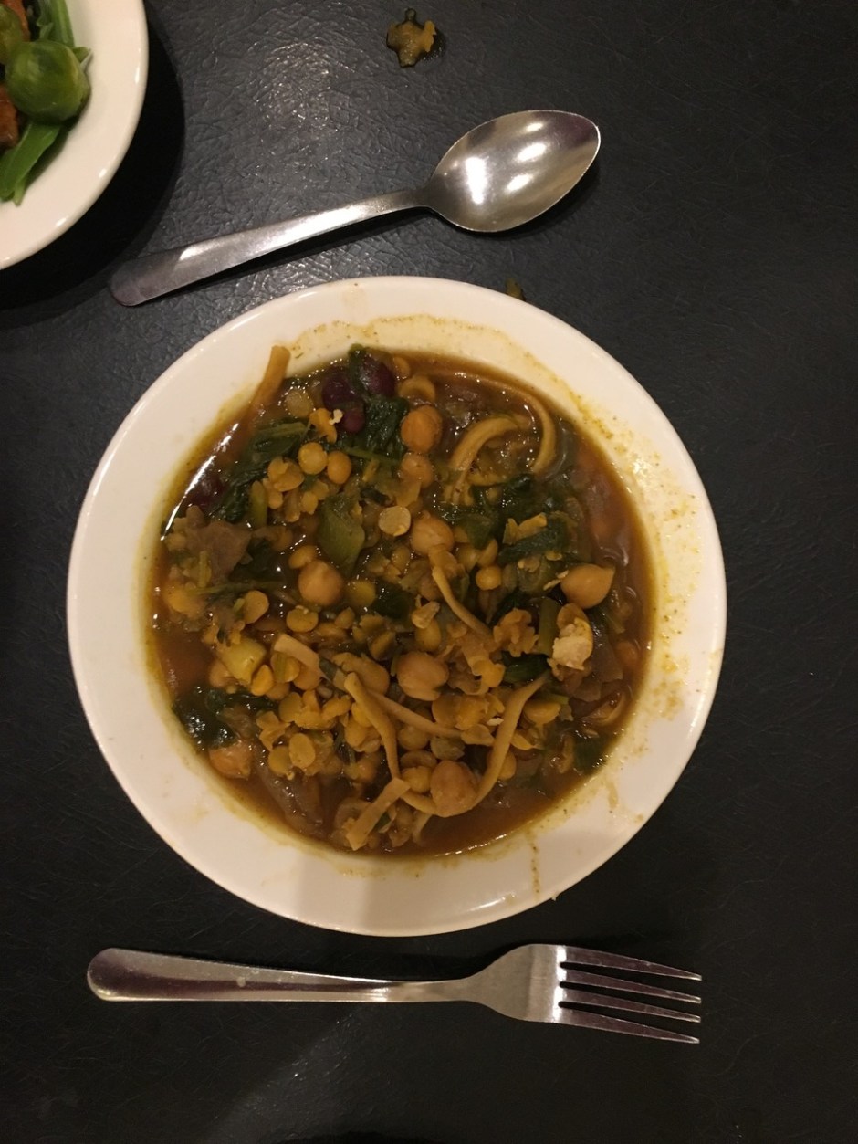 What makes this soup so incredible is the way it combines flavor with healthiness. It’s got legumes: protein. It’s got noodles: carbs. It’s got spinach and fresh herbs: healthiness. Everything is simmered together with onions and garlic and turmeric. Oh yeah, and butter…lots of butter. It’s a flavor powerhouse and a balanced meal all in itself. This weekend, I decided to bring back some fond memories and make myself a heaping pot-full. It ended up lasting me seven meals, which came in handy especially on Tuesday and Thursday, when I have nonstop class from 10:00 to 2:30 (plus section until 4:30 on Tuesdays!). Hopefully my French 40 classmates didn’t mind the wafting aroma of turmeric-y, dill-filled legume noodle soup as we analyzed French cinematography…