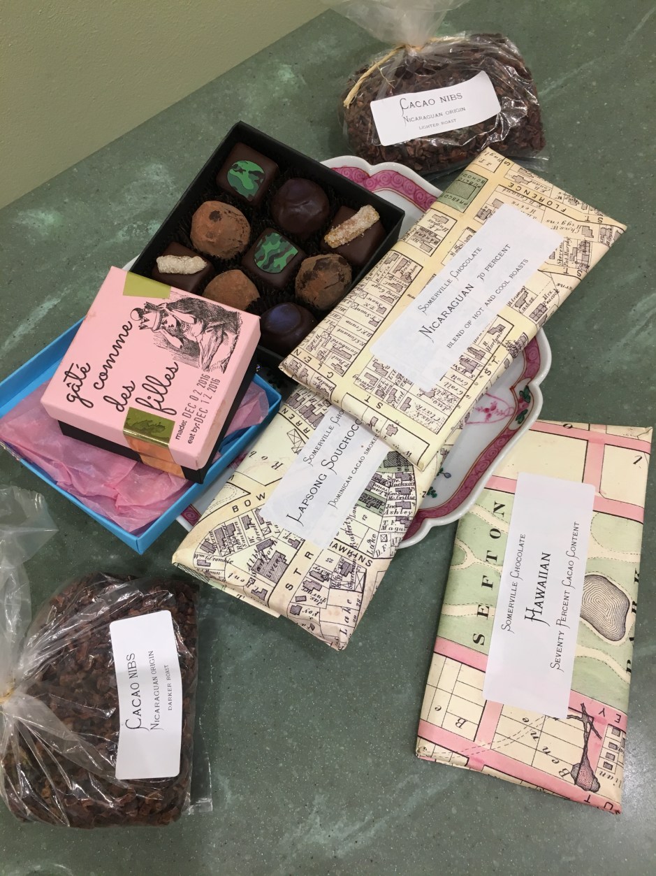 There are two main types of treats – French-style bon bons (provided by Gâté Comme des Filles) and chocolate bars (provided by Somerville Chocolates). Bon bons are creamy ganaches hand-dipped in a thin chocolate coating. With only two ingredients, cacao and sugar, the bean-to-bar chocolate brings sweetness down to its core raw goodness. The shop’s most popular items are the Hawaiian chocolate bar and honey-walnut and vanilla bean bon bons.